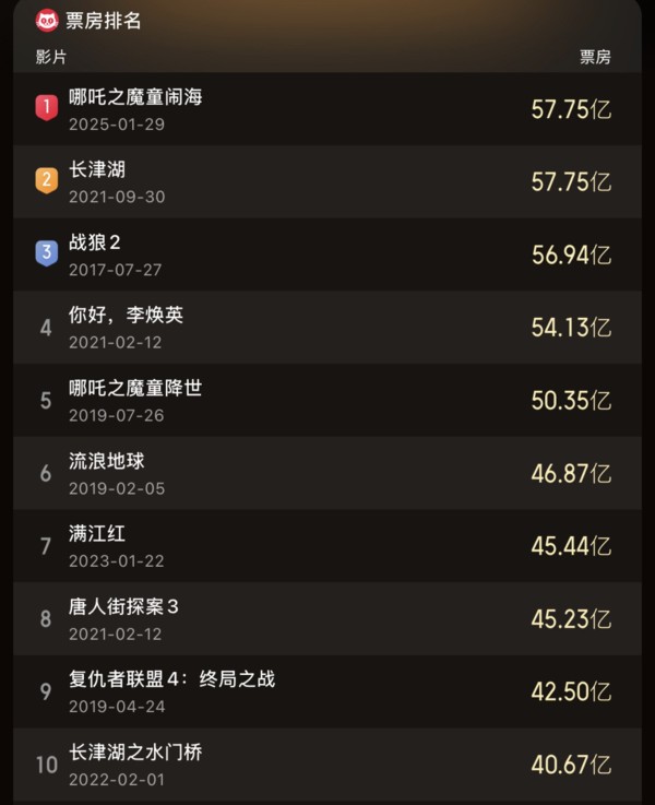 《哪吒之魔童闹海》超《战狼2》了,成为中国电影票房总榜第二