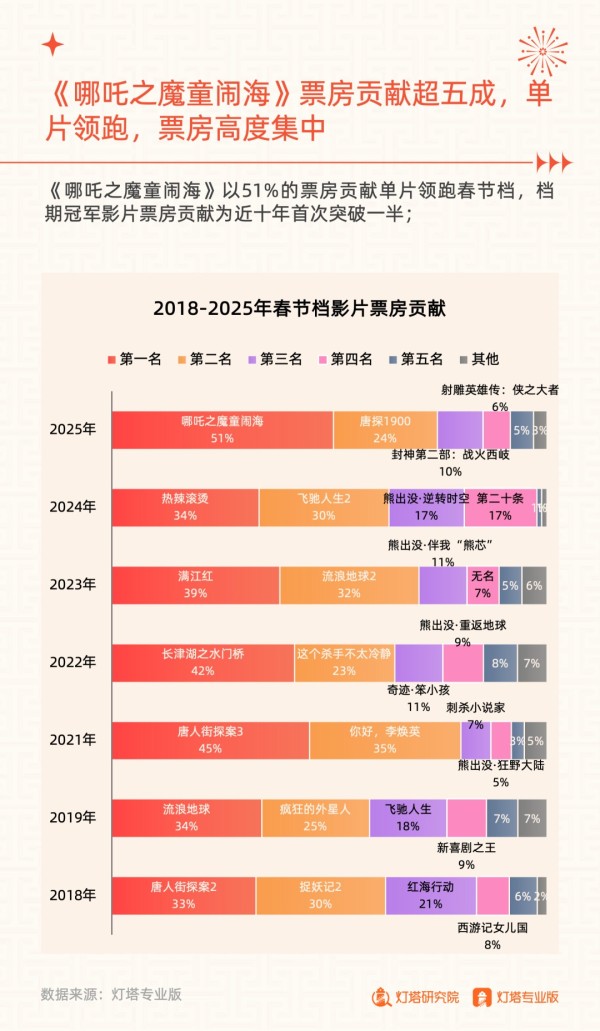 好在春节档的魔法时隔多年再次起效,《哪吒》从上映到破纪录仅用了8天5小时。灯塔专业版数据显示,《哪吒》的头部效应非常明显,这一部电影占据了整个春节档总票房的一半以上,过去十年来春节档从未见过如此的集中度。