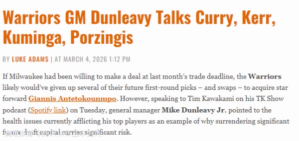 不过,勇士总经理小迈克-邓利维在做客播客节目时表示,球队核心球员接连出现伤病,恰恰说明透支大量未来选秀资产存在巨大风险。