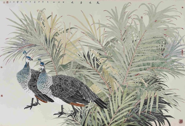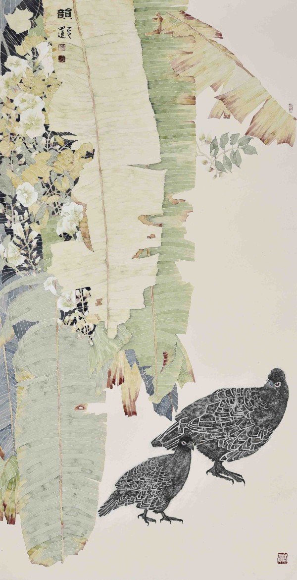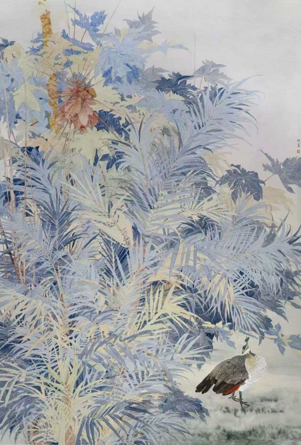 她善于调控水与色的比例与交融时机,使得色彩在画面上自然渗化、叠加,产生微妙而丰富的肌理效果,仿佛自然天成,毫无雕琢之感。这种对色彩的精准驾驭,使她的花鸟世界既保持了传统东方的含蓄韵致,又焕发出符合当代审美的新鲜活力。