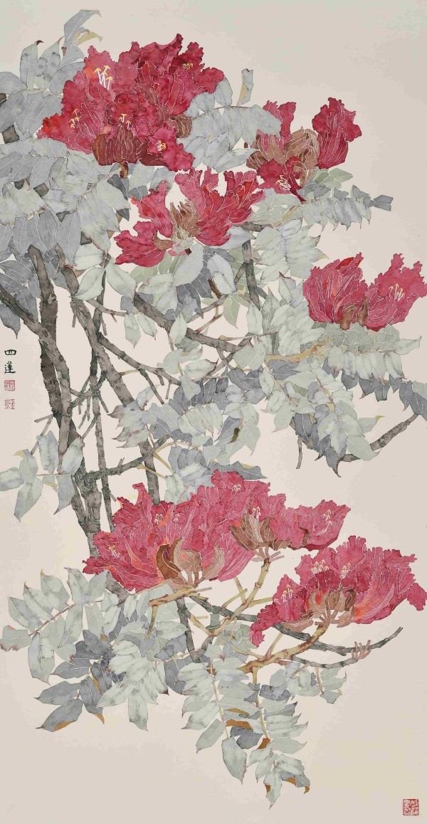 其次,在笔墨意蕴上,她强化了书写性。她将陈淳写意花鸟中的笔意,更为自觉地融入没骨创作。其笔下的一花一叶,不仅是“染”出来的,更是“写”出来的。她以笔摄色,色随笔走,在敷染色彩的过程中,蕴含着提拔、转折、轻重的书法用笔。这使得她的花卉枝叶,在形态饱满、色彩淋漓之外,更具备了内在的骨力与节奏感。