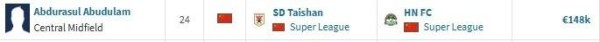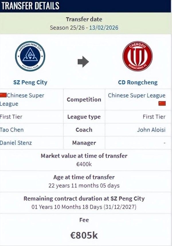 另外德转显示,成都蓉城从深圳新鹏城引进拜合拉木,转会费约650万人民币。拜合拉木上赛季在俱乐部数据虽然不光鲜,但这名22岁国脚前锋打国字号比赛是不可或缺的主力,战术作用明显。目前他为国家队出场9次,打进2球。德转身价为40万欧元。对于650万元人民币的转会费,球迷见仁见智。有球迷对比从北京国安转至浙江的方昊,还500万转会费呢。