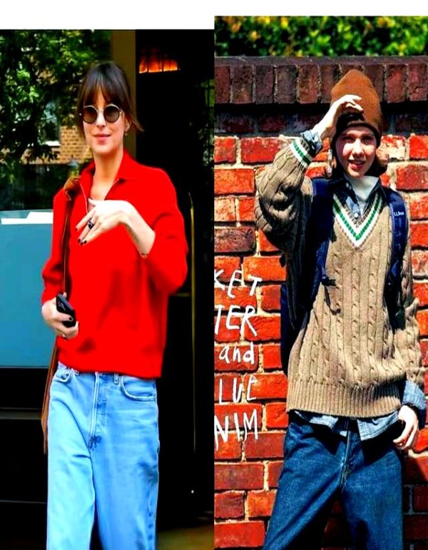 在明星和时尚博主的引领下,牛仔阔腿裤的搭配方式愈发多样化,实用性也大大增强。吸引眼球的搭配如短款皮衣与高腰阔腿牛仔裤,以及利用"上宽下长"比例技巧,展现显瘦效果和时尚感。例如,Hailey Bieber选择短款皮衣与高腰阔腿牛仔裤配厚底靴,打造出街头潮流感。