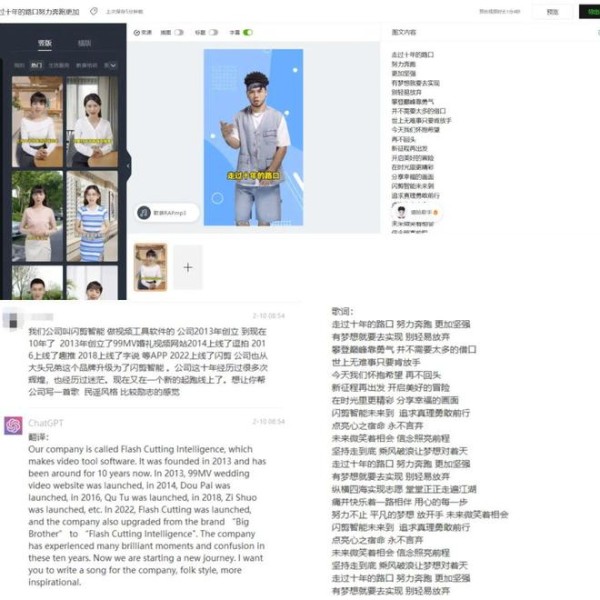 没想到上午短短3小时,就完成了60条视频,2人120条视频1天干完绝对妥妥滴,下面给大家展示一段ChatGPT生产歌词+数字人,唱给闪剪的企业之歌。