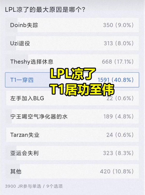 40%的玩家认为,去年T1战队一穿四打败LPL,居功至伟。TheShy选择去休息,则是第二大原因。除此之外,Doinb、亚运会和UZI等等,也都有一定原因。甚至还有一个离谱选项,宁王喝空气净化器里的水……