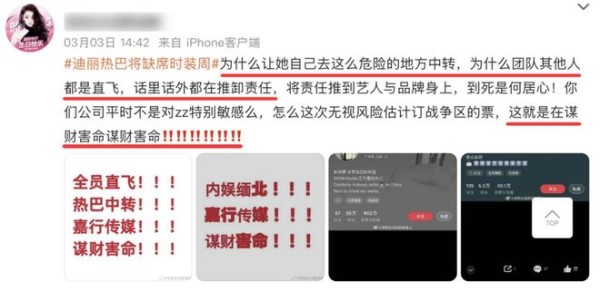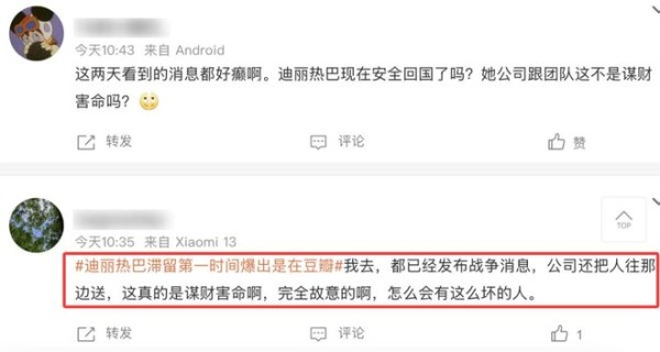 迪丽热巴滞留的消息,直到两天后才被曝光,粉丝一边焦急担心她的安全,一边严厉指责公司不顾艺人安危,漠视国家预警。随着舆论声量越来越大,迪丽热巴工作室才姗姗来迟发布声明,称因不可抗力因素,迪丽热巴将缺席巴黎迪奥大秀,仅在公告末尾轻描淡写地表示“热巴目前平安”。