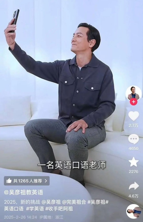 起初,大伙只当这是网友在玩梗,或者怀疑这是AI合成的视频,还有粉丝出来打假……就在大家将信将疑之时,吴彦祖本人闪现评论区,证实了这个账号就是本人。网友的态度从半信半疑变为学习欲,跟着吴彦祖的视频就学起了地道的英语口语。他就办派对、逛超市、点咖啡、入住酒店等多个场景设计了情景对话,还有一些紧跟热点的电影台词,例如如何用地道的英语翻译动画电影《哪吒》里诸如“急急如律令”“我命由我不由天”等台词。