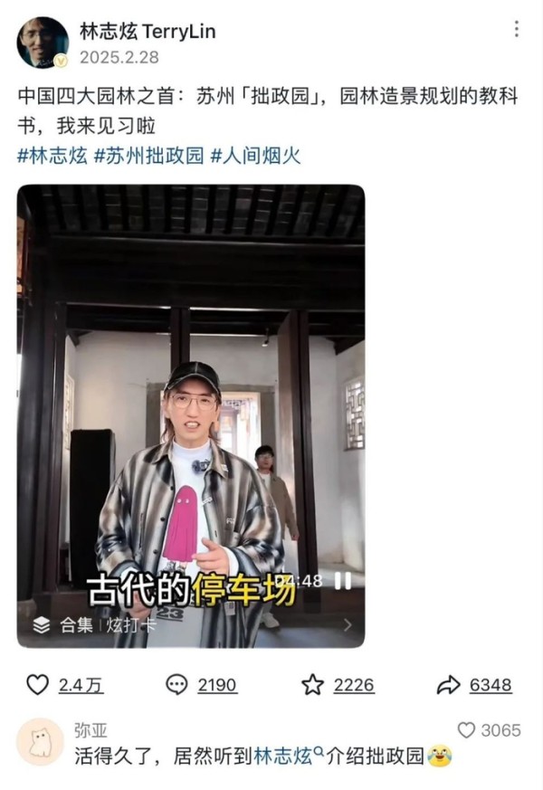 不仅仅是吴彦祖、王祖贤,最近还有很多娱乐圈明星在认认真真地搞副业——最近有网友爆料,2月28日,有网友在苏州拙政园碰到林志炫,紧接着林志炫在自己的社交平台上分享了他在拙政园录制的将近5分钟的视频,视频中,他变身“导游”给网友们讲解起拙政园的各种知识,从“古代停车场”聊到“岁寒三友”。网友纷纷发声:“林导游真是太厉害了!”还有网友普及:“林志炫是土木工程专业毕业,他讲解园林知识也算回归老本行。”