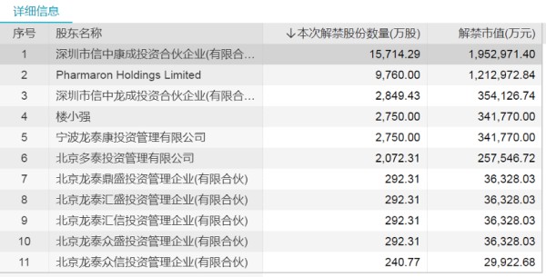康龙化成解禁详细信息