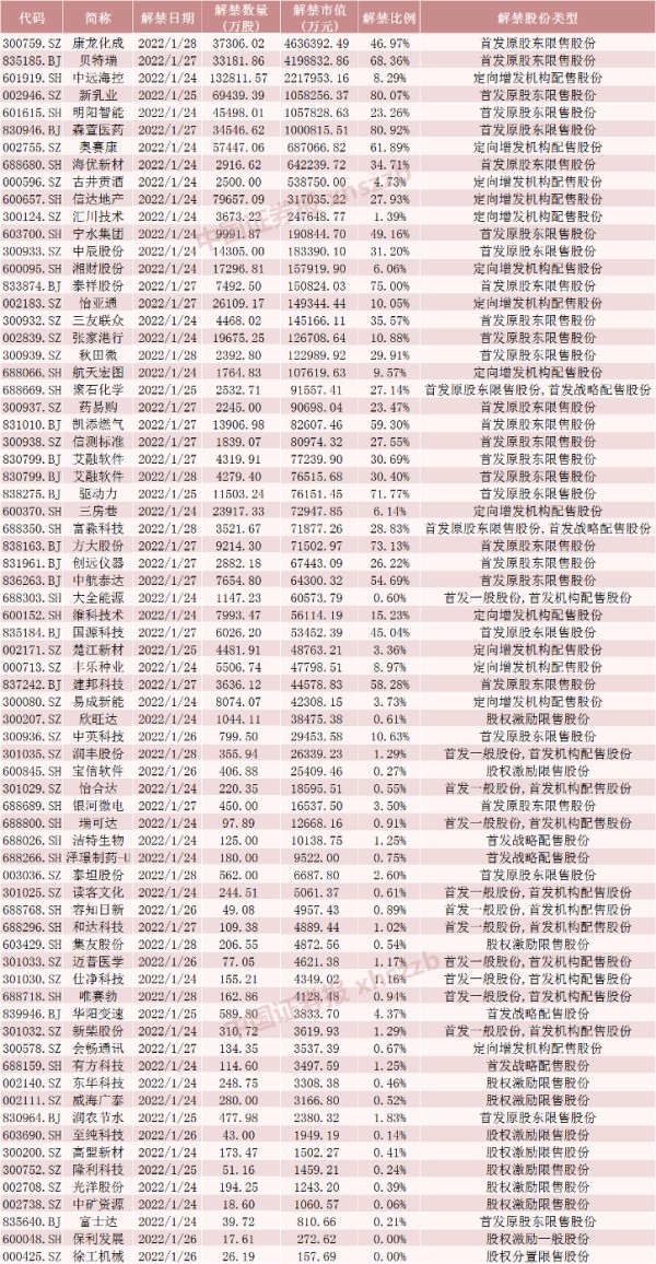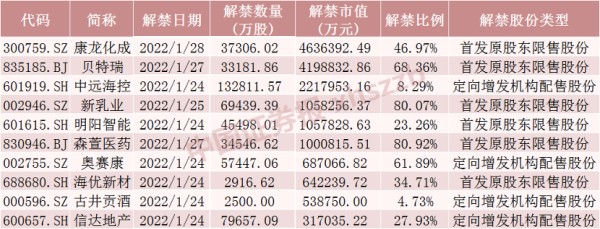 具体来看,Wind数据显示,康龙化成1月28日将解禁3.73亿股,均为首发原股东限售股份。贝特瑞1月27日将解禁3.32亿股,均为首发原股东限售股份。中远海控1月24日将解禁13.28亿股,均为定向增发机构配售股份。
