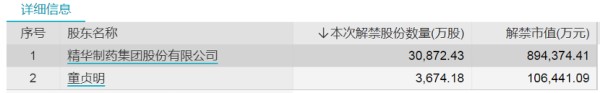 值得注意的是,新冠口服药概念大牛股森萱医药下周解禁后流通盘将增加超4倍。森萱医药下周解禁市值达100.08亿元,解禁数量为3.45亿股,来自精华制药(7.560, 0.14, 1.89%)集团股份有限公司和童贞明两位股东,分别为森萱医药第一和第二大股东,其中精华制药集团股份有限公司解禁市值近90亿元。