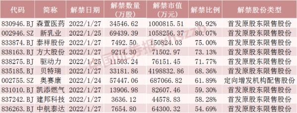 Wind数据显示,在下周面临解禁的71只股票中,有7只股票解禁股数量占总股本比例超过60%,分别为森萱医药、新乳业、泰祥股份、方大股份、驱动力、贝特瑞、奥赛康(14.560, 0.19, 1.32%),解禁比例分别为80.92%、80.07%、75.00%、73.13%、71.77%、68.36%、61.89%。