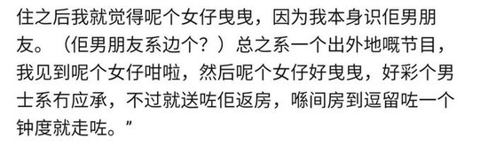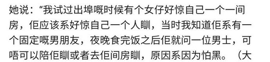 林秀怡在节目上爆料,称自己有一次外出拍节目的时候,有一个女艺人单独睡在一个房间。其实这位女艺人是有男友的,而且林秀怡也认识她的男友,不过此次只有女艺人一个人出来工作。