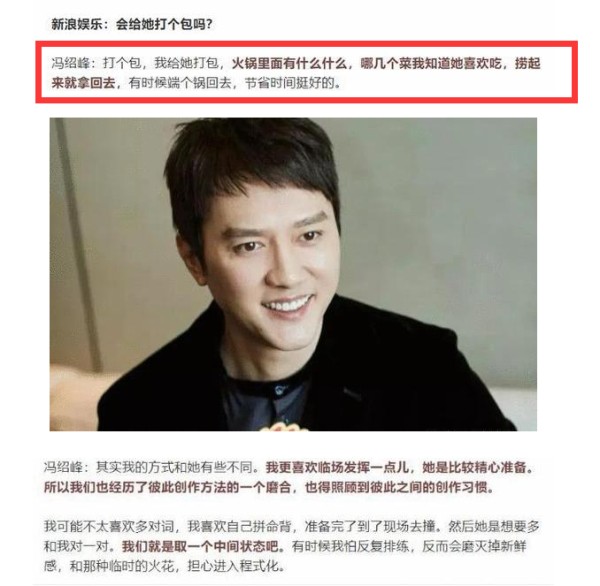 冯绍峰婚后非常宠爱颖宝。根据冯绍峰的透露,在日常生活中他对颖宝是极其宠爱的,跟友人聚餐他不忘给妻子打包,甚至吃火锅也一样,直接端个锅就回去了,而且他也知道赵丽颖喜欢吃哪些菜,这样的冯绍峰显然是让人安心的。