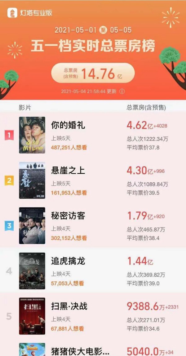 截至5月4日21:58,灯塔数据显示五一档总票房(含预售)达到14.76亿,今年大概率会超过2019年15.3亿的成绩。但此前灯塔研究院发布的《中国电影市场趋势分析报告》预计2021年五一档票房规模不低于18亿,按目前的走势就比较难实现了。