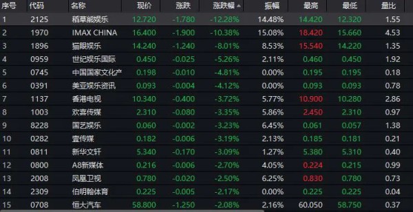5月3日港股开市,影视股却集体收跌,稻草熊娱乐下跌了11.72%,IMAX中国下跌11.48%,猫眼娱乐下跌6.98%,欢喜传媒下跌5.44%,华谊腾讯娱乐下跌5.38%,阿里影业下跌3.54%。