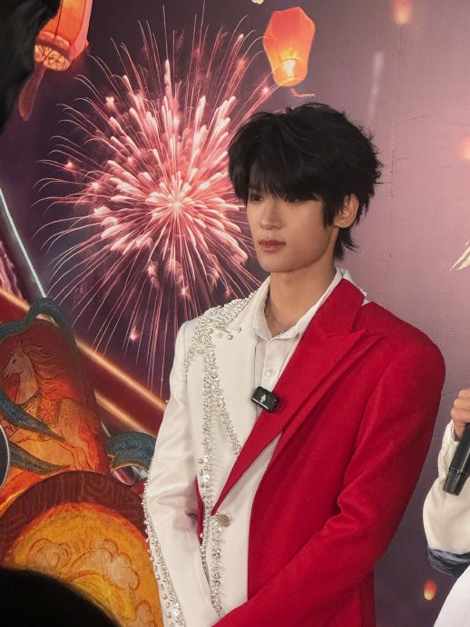 面对“黄金右脸”的趣味话题,张峻豪展现出独特的幽默感。当被问及“放弃鱿鱼帽还是脸”时,他调侃道:“我肯定放弃鱿鱼帽,它是身外之物。如果我有两个黄金右脸可以对称,我就无敌了!”现场笑声中,他认真补充:“总不能不要脸吧?”这种自嘲式的回应,既化解了外貌标签的压力,又拉近了与粉丝的距离。后台花絮还捕捉到他分发巧克力的暖心画面——身着红白西装的他,在节目环节中向工作人员递上糖果,并轻声祝福“2026年收获美好与福气”,将传统节日的团圆寓意化为具象的甜蜜互动。