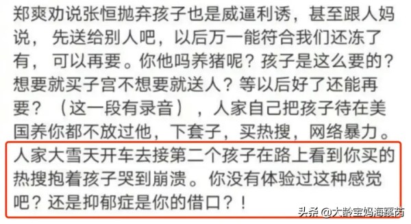 无论双方有什么样的争议?两个孩子都不是他们彼此交换的筹码。作为有两个孩子的大龄宝妈,我深知自己孕育孩子的辛苦,可也体会到了小生命诞生的欣喜, 对于郑爽的这种行为,我实在是理解不了。可能对于他来说,孩子就是一个用钱换的那商品。没有多少感情的成分在里边。想要就要不想要就随便丢弃。而那个男人张恒也不是什么好东西。他如果对孩子好的话,也不会拿孩子作为筹码。要挟郑爽曝光隐私。[发怒][发怒][发怒][发怒]