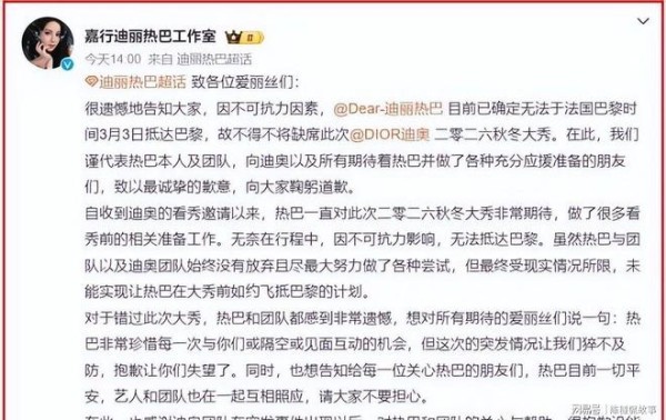 迪丽热巴原定从国内飞巴黎参加3月3日迪奥秋冬大秀,2月27日出发,28日抵迪拜转机。团队其他人直飞巴黎,她一人中转,结果赶上机场关闭,被困当地。粉丝在网上爆料,质疑团队为什么不统一安排直飞,让她单独滞留高风险区。