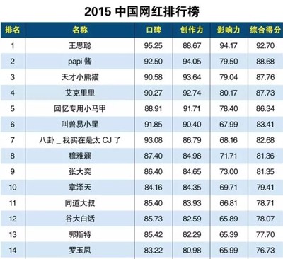 昨天《互联网周刊》2015年中国网红排行榜出炉,让网友们各个惊呆了,网红夺冠的竟然不是那些锥子脸、大眼睛、高鼻梁、拥有欧式双眼皮的网红美眉们,也不是正当红的一个集美貌与才华于一身的女子papi酱,而是集金钱和才华于一身的男子“聪懒”——王思聪力压群红夺得“红冠”。