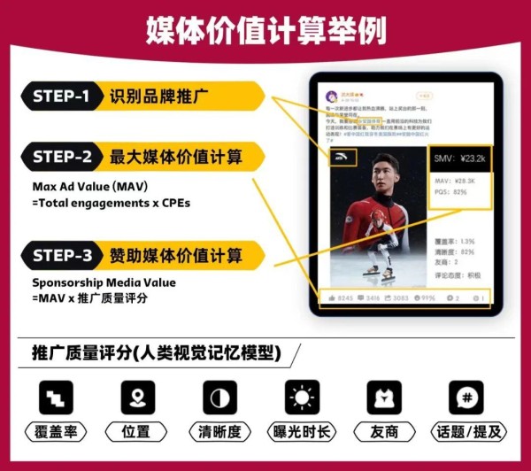 据称,该媒体价值分析与计算,是通过3000+监测账号在国内主流社交平台的发帖以及各大平台UGC内容的曝光以及互动数据,对世界杯相关内容的发帖(文章、视频)中的文字、图片、视频进行品牌分析,使用针对体育行业定制化的AI技术识别曝光的品牌,并计算因传播所获得的媒体价值。