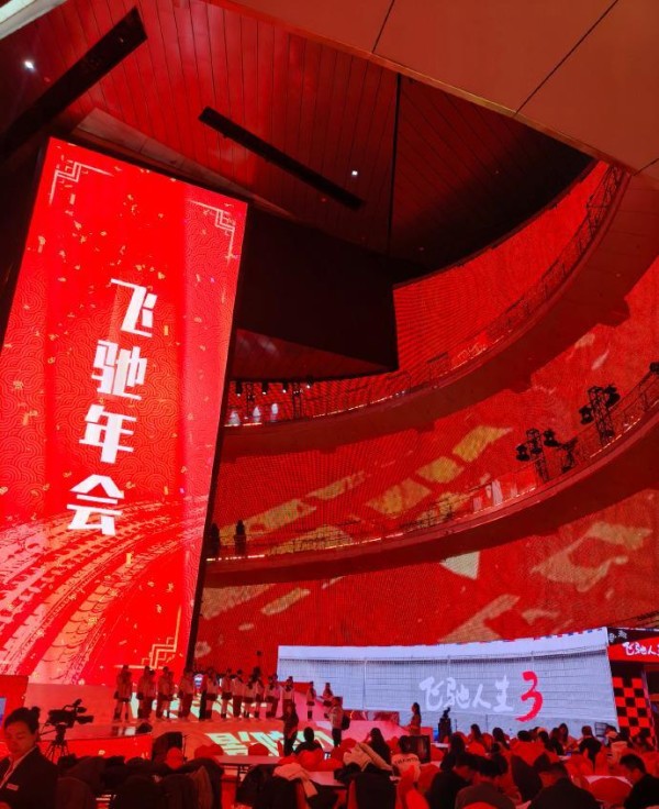 《飞驰人生3》那一块用的是大红色调,既呼应片名里红色的“3”,也充满年味儿,喜庆感十足。整体布置显然下了功夫,舞台、灯光、LED大屏都挺讲究。台下摆了大圆桌,估计是给嘉宾和领导准备的,彩排时还能看到合唱团,不清楚会唱啥。现场还挂着大幅海报,写着“飞驰年会”,感觉要把主创团队都请上台亮相。