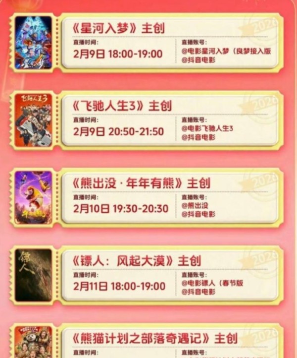 听说发布会后,《星河入梦》《飞驰人生3》《熊出没·年年有熊》《镖人》和《熊猫计划2》这五部片子还会继续线上直播,感兴趣的朋友可以盯着看;另外2月9日这些影片也会开启预售。
