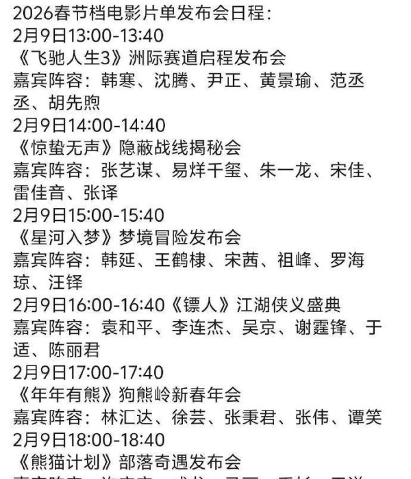 造成这种局面的原因之一,是行业里也在倡导别内卷,大家把宣发节奏往有序里推。往年谁都往外砸钱抢曝光,结果是零和博弈,最后没人真正赚到大优势。今年电影局统一部署,把“中国电影新春嘉年华”交给电影频道承办,等于是上面主导、平台搭台,计划在2月9日下午3:30给观众呈现一场集中亮相。