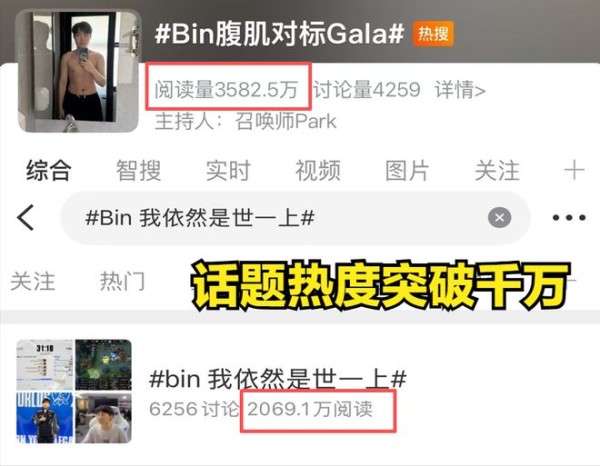 不过最近LPL赛区的选手们有点异常,例如BLG战队上单Bin选手,在输了比赛后仍然发帖说道:“我依然是世一上”,以及发帖图配文“其实我的也还行”回应Gala的健身照,两个话题热度都突破千万,这一系列的离谱操作让网友们不得不认为:Bin哥是在为LPL赛区引流。