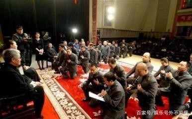 岐收徒过程也是霸气十足,只见其师父赵本山和师母马丽娟坐在太师椅上,弟子们则清一色的中山装,单膝跪地接受训话,场面十分壮观。