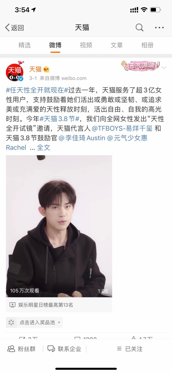 随着越来越多敢于表达真实想法和姿态的女性走入公众视野并受到欣赏和关注。有着超3亿女性用户的天猫,决定在3.8节即将到来之际,首先向全网女性发出「天性全开试镜」邀请。由天猫代言人易烊千玺和天猫3.8节鼓励官们一同参与号召,同时邀请《世间有她》主创团队、女性创始人等天性各异的优秀女性参与进来,鼓励全体女性勇敢、坚韧,释放天性,活出自我,展现自己的高光时刻。