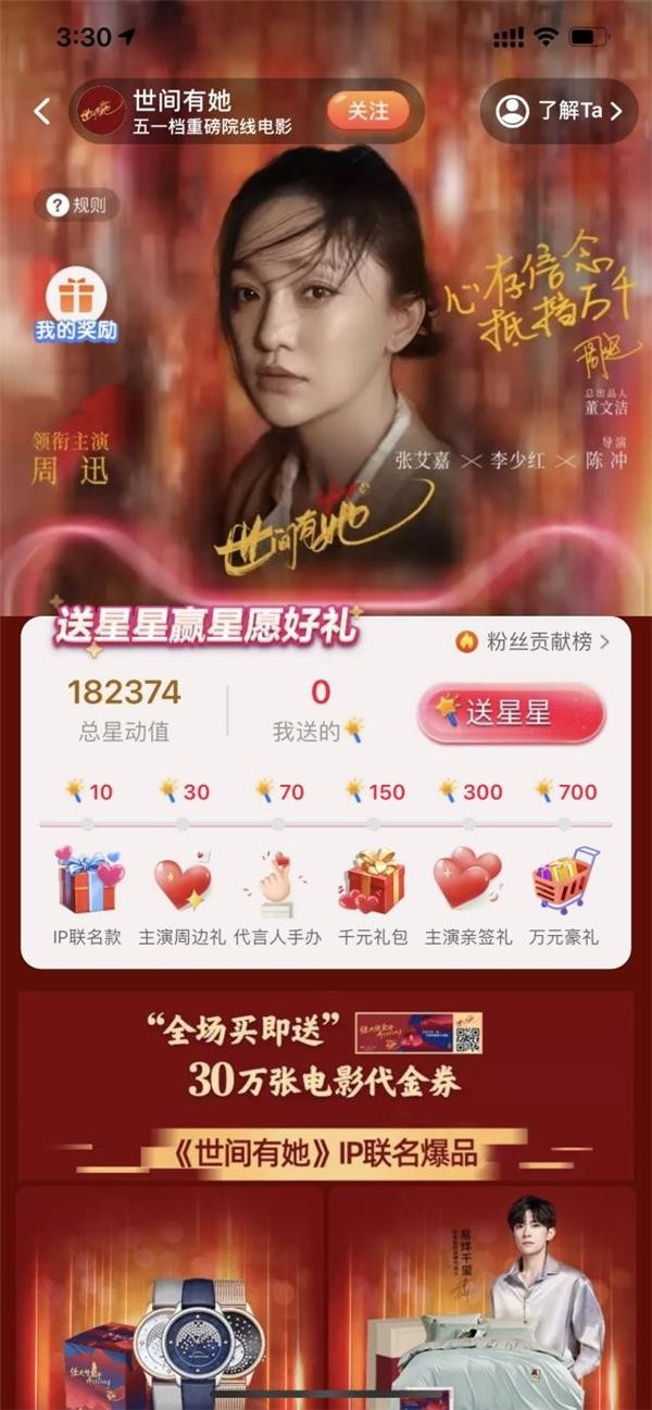 在「天猫全明星计划」的互动加持下,天猫平台的商家一起参与到与《世间有她》的传播合作之中。只要在淘宝或天猫搜索「世间有她」,即可参与到为电影助力的活动中。不仅为粉丝们带来了IP联名的爆款商品,而且在购买和助力的同时还有30万张电影代金券的送出。同时还有周边礼品、代言人手办、亲笔签名礼品等诸多福利。