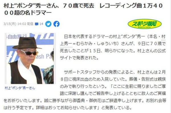 据日媒透露,村上秀一今年突发脑溢血,2月8日入院治疗,至3月9日病逝,从病发到去世仅一个月的时间,其生前所在公司发文感谢歌迷多次支持:“对生前赐予我们的友谊表示深深的谢意,并向故人表示哀悼。”