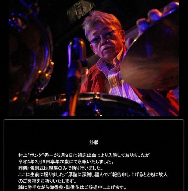 村上秀一生前先后加入“赤鸟的居所”、 ponta box”、“新ponta box”等组合,是一位的乐坛常青树,生前名声享誉海外,是日本乐手的代表人物。