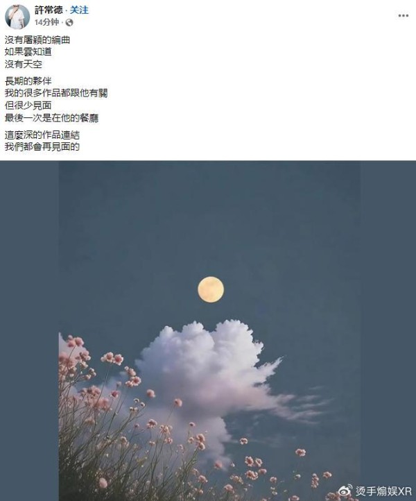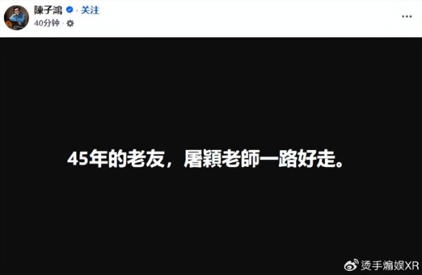这场突发意外,让许多好友难以接受,纷纷发文送别,陈子鸿也悲痛表示“45年的老友,屠颖老师一路好走”,许常德也感叹“没有屠颖的编曲,如果云知道,没有天空。长期的伙伴,我的很多作品都跟他有关,但很少见面,最后一次是在他的餐厅,这么深的作品连接,我们都会再见面的”。