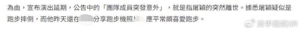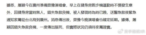 据友人透露,屠颖现在正在广州准备齐豫的演唱会,早上在健身房跑步机运动时不慎发生意外,因健身房当时无人,错失了最佳的抢救时机,被人发现时已经为时已晚,送医院急救后紧急通知家属从台北飞到广州。