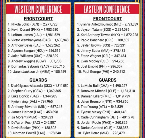 2025全明星赛事步伐已然临近,第二轮投票在今日也由NBA官方给出了具体的票数和排名。此番,所统计的依然是球迷投给各自支持球员的票数,占比为最终结果的50%。
