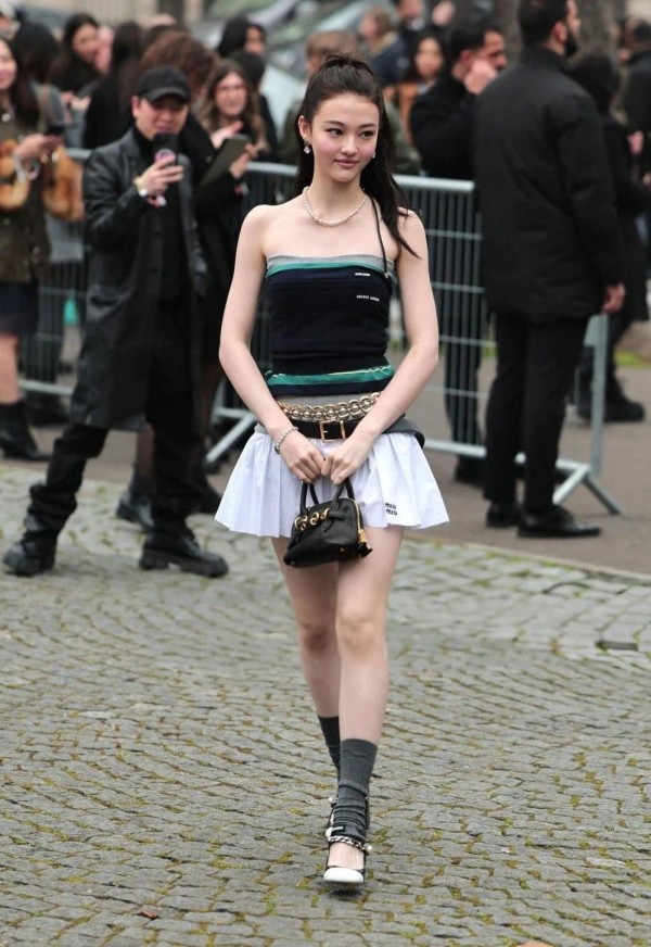 亚洲明星们无疑是这场大秀的“时尚先锋队”。刘柏辛Lexie以她独特的气质和大胆的穿搭,仿佛是从未来穿越而来的时尚使者,她的每一次亮相都像是在为传统时尚规则按下“重启键”。王源则以他那标志性的少年感,完美诠释了Miu Miu的中性美学,让人不禁感叹:时尚界的新宠儿,果然名不虚传!张元英更是以“牛仔芭比”的形象惊艳全场,她那俏皮的牛仔帽搭配甜美的笑容,仿佛把整个秀场都变成了她的时尚游乐场。Minnie和Momo也不甘示弱,一个以潇洒慵懒的风格诠释“酷女孩”的魅力,一个则以优雅的裙装展现“甜妹”的温柔,而Ella更是以她那率性时髦的穿搭,证明了Miu Miu女孩可以是任何风格,只要敢于做自己。