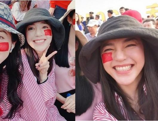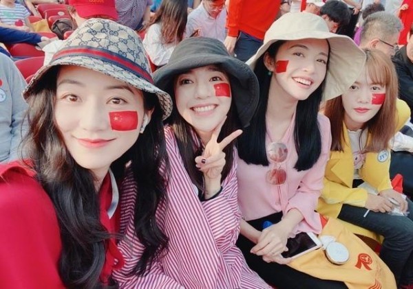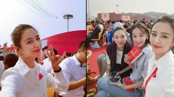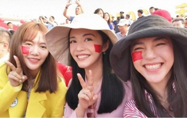 10月1日韩雪、姚晨、谭维维,喻越越等女星在现场看阅兵,晒自拍照。每个人脸上都印了一面耀眼的国旗,大家心情非常愉悦开心,各种比V,各种摆pose、各种凹造型,统统都美翻了。