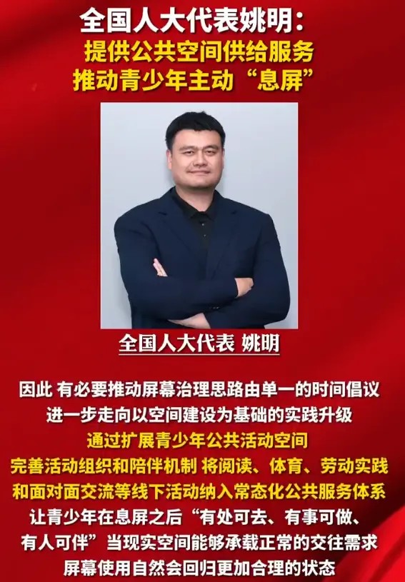 全国人大代表姚明则继续把目光投向青少年屏幕依赖问题。