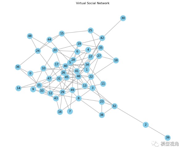 我们构建了一个虚拟的社交网络,使用Erdós-Rényi模型生成了一个随机图(Erdős-Rényi模型 (ER模型) 是随机图理论中的一个经典模型,它是由Paul Erdős和Alfréd Rényi在20世纪60年代独立提出的。ER模型描述了一个随机过程,用来生成随机图)。