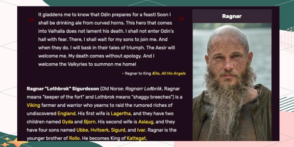 图2展示了Vikings Wiki上角色Ragnar的个人简历。通过深入探索其详细信息,我们可以发现其简介中不仅包含了他本人的详细介绍,还链接到了众多与他相关的其他角色,如他的妻子Lagertha、子女Gyda和Bjorn,以及背信弃义的兄弟Rollo。这些链接为我们揭示了一个复杂的社交网络。