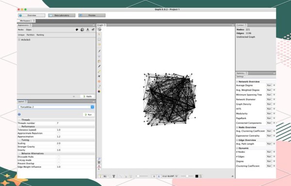以Gephi中打开的原始关系图为基础,我着手进行最终的设计调整。首要任务是依据节点的重要程度来设定其大小。我选择了Force Atlas 2布局算法,它能够将关系图中的节点布置在一个平面上,通过模拟物理引力来推拉节点,从而直观地揭示网络的核心结构。
