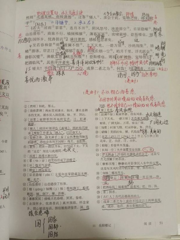 他用两个段落,分别描写了“霪雨霏霏”时的悲与“春和景明”时的喜,将迁客骚人的情感变化写得淋漓尽致。
