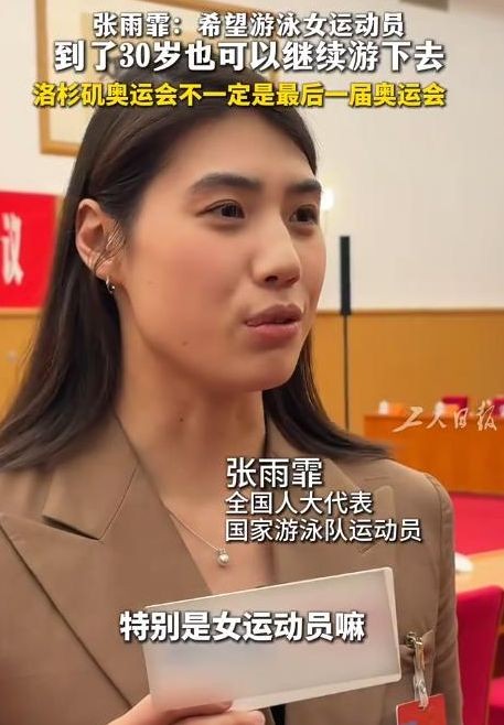 熟悉张雨霏的人都知道,她从来都是敢说敢做、心系同行的姑娘。上一年参会时,她就呼吁饭圈粉丝,不要过度关注体育明星本身,应该将更多注意力放在体育项目的成绩上,引导粉丝树立正确的追星观。而今年,她再次为运动员发声,重点关注女性运动员的发展,希望游泳女运动员到了30岁,也能有继续站上赛场的机会,呼吁给女性运动员更多包容和发展空间。