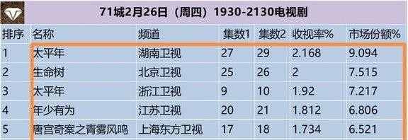 电视剧收视率榜单,生命树降至第二,第一高达2168