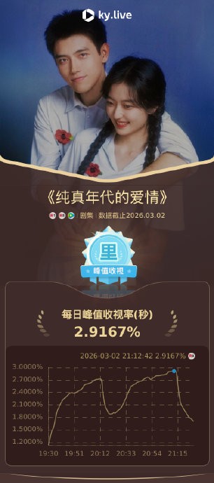 该剧自2026年2月21日登陆央视八套黄金档以来,收视率呈现罕见持续攀升态势。开播首日双集平均收视率达1.6093%,酷云实时峰值突破1.94%;此后连续十日上涨,酷云实时收视峰值飙升至2.9167%,刷新央八频道年度纪录,并成为2026年首个CVB单日破2的剧集。欢网数据进一步佐证其统治力:黄金时段收视率高达3.1827%,市场份额14.4532%,累计斩获50项高光成就。同期网络端表现同样亮眼,腾讯视频站内热度值突破28000,刷新平台“萤火单元”历史最高纪录;云合数据市占率峰值达20.2%,猫眼全网热度累计登顶10次,灯塔专业版显示正片播放量破3亿。