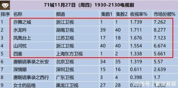 电视剧收视率排行榜,《凤凰台上》跌至第三,第一收视高达1.739%