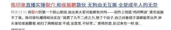 其实三个月前,两人裂穴的消息就已悄然流出,那段时间,相声圈的讨论五花八门,乱象丛生。有人说是分赃不均,有人说是私下结了仇,更有人编出宫斗大戏般的故事。毕竟,相声搭档散伙,大多结局不美,要么撕破脸皮,要么断绝往来。陈印泉与侯振鹏最早是在网络论坛上因为对相声的热爱而相识,完全没有经纪公司包装,也没有资本推手的操作,就是纯粹的志同道合。两人从庙会、酒吧到茶馆摸爬滚打,2008年一起进入当时名声响亮的嘻哈包袱铺。那时候说相声真不是为了赚钱,一场演出下来,分的钱顶多够两人凑一顿宵夜,但那份为了一个包袱讨论整晚的纯粹乐趣,是成名之后难以再寻的。