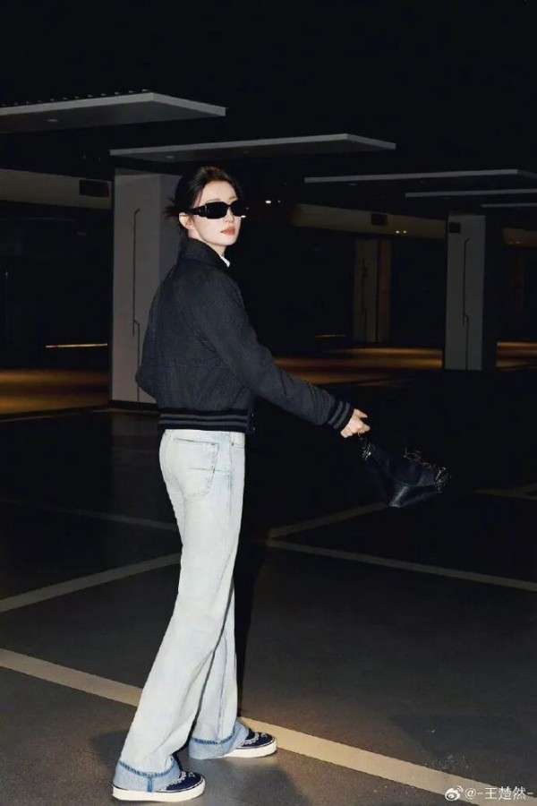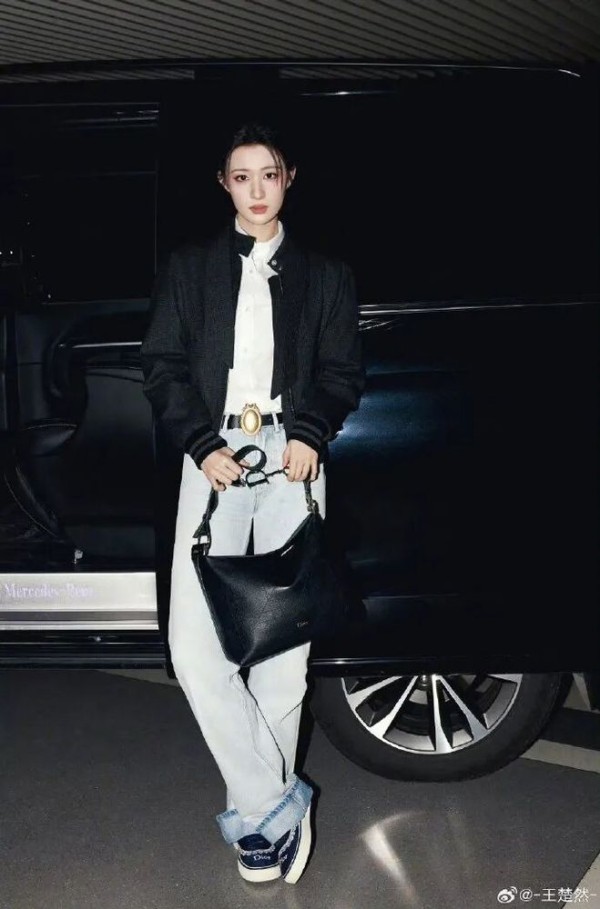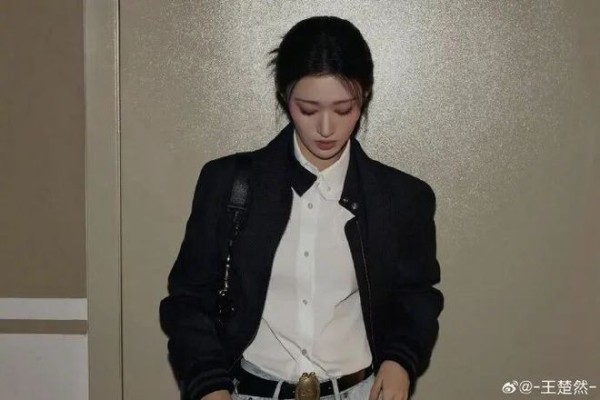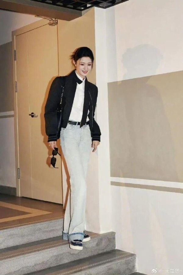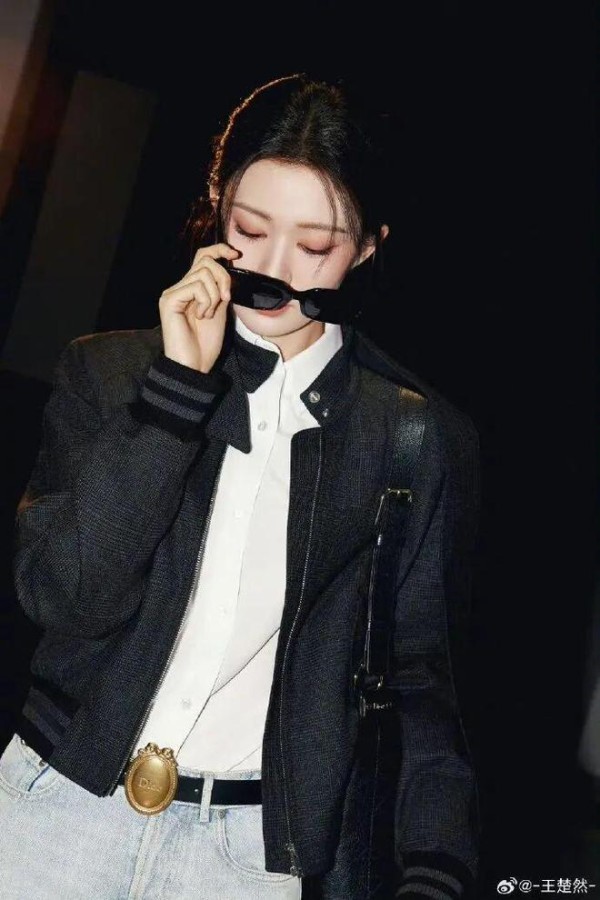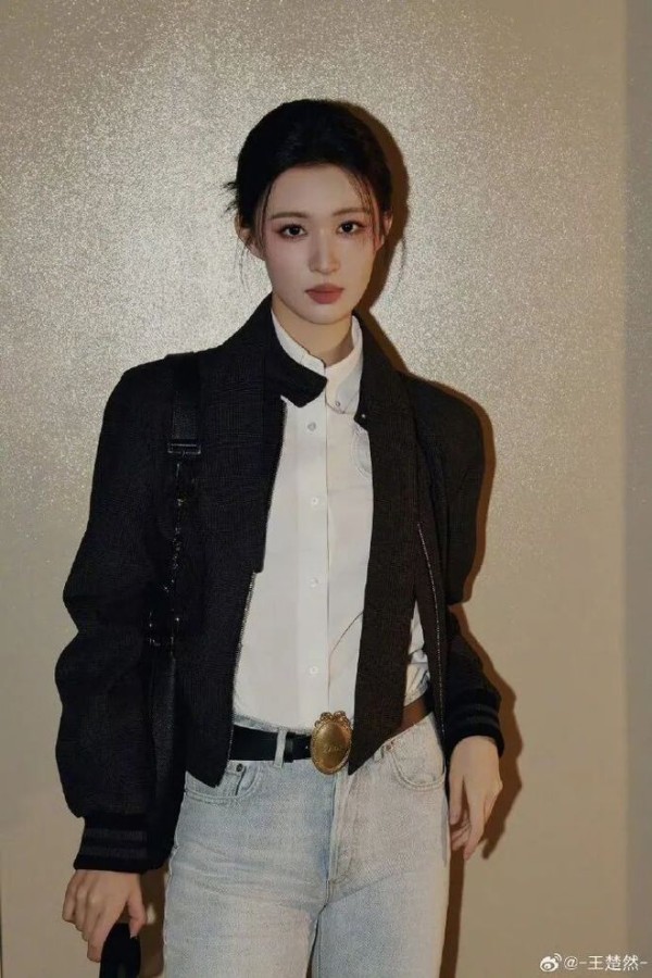 内搭的挺括白衬衫,是整套造型的呼吸感担当。很多人搭黑色外套总爱用花里胡哨的内搭,反而显得杂乱油腻,但王楚然这套,用最基础的纯棉白衬衫做基底,解开的两颗领口扣子,刚好露出纤细的锁骨,不刻意露肤,却比大 V 领更有松弛的氛围感;利落的翻领从夹克领口露出来,和黑夹克形成了最经典的黑白对冲,干净、利落、不杂乱,瞬间中和了黑色外套的厚重感,哪怕是全黑的上半身,也完全不会显得沉闷,把干练与清爽平衡得刚刚好。